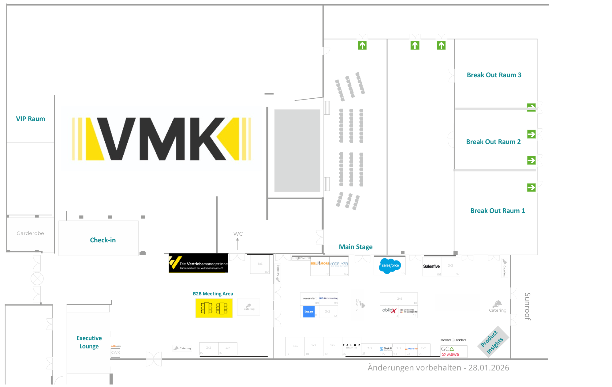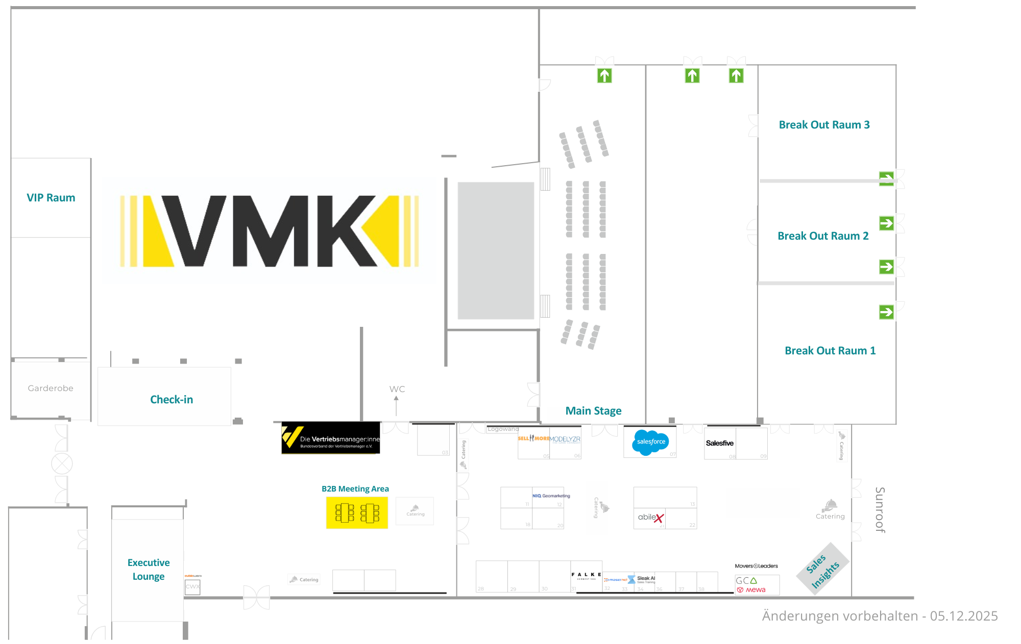 Das lichtdurchflutete Foyer ist mit den Cateringinseln, der B2B Meeting Area, einer Working Zone und der Lounge des Bundesverbands der Vertriebsmanager:innen auch zugleich das pulsierende Herz und die Seele des Events. Hier treffen sich die Teilnehmende, Speaker und Aussteller zum Mittagessen und in den Kaffeepausen, knüpfen neue Kontakte und diskutieren über Herausforderungen im Vertriebsmanagement.